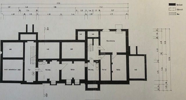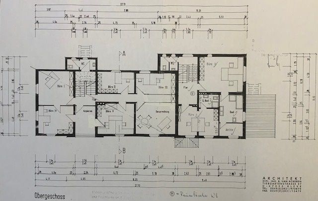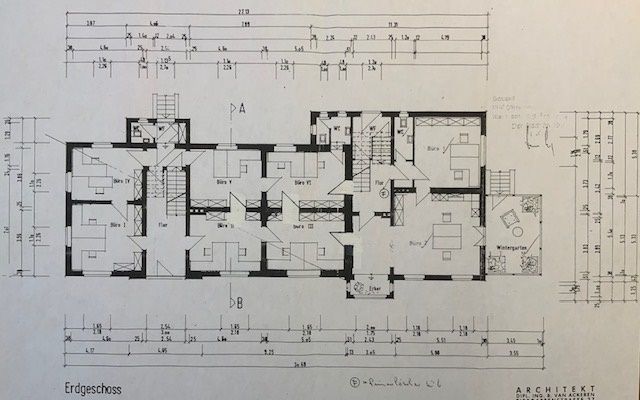 Mit dem Mieter des Obergeschosses (204 qm) ist vereinbart, dass auch eine andere Aufteilung der Räume - z.B. vertikal - möglich ist. Wie den unten abgebildeten Grundrissen des Gebäudes zu entnehmen ist, bietet das „Alte Forsthaus“ aufgrund von zwei Treppenhäusern und drei Eingangsbereichen viele Aufteilungsmöglichkeiten, die eine flexible, auch abgeschlossene Nutzung der Flächen nach den Bedürfnissen der Mieter möglich machen.